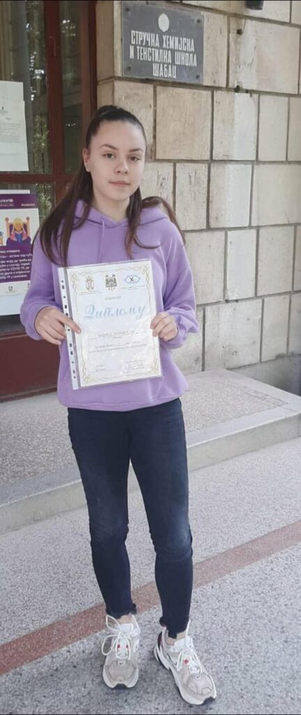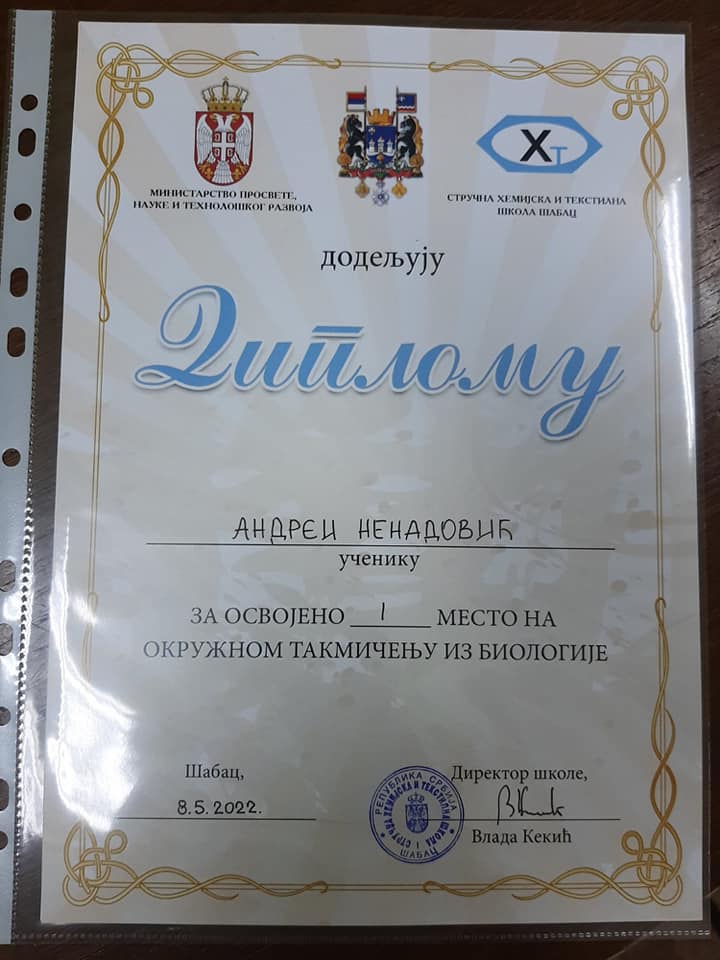 Андреа Ненадовић, ученица другог разреда гимназије, освојила је прво место на Окружном такмичењу из биологије одржаном данас у Шапцу и тако се пласирала на републички ниво такмичења. Ученицу је припремала за такмичење Биљана Јањић, професор биологије.