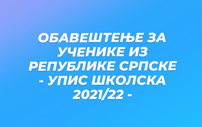 ВишеУпис ученика у први разред (први уписни круг) непосредно у школи обавиће се 12. и 13. јула 2021. годинe од 8:00 до 15:00 часова. Документа потребна за упис су:Сведочанства 6, 7. и 8. разреда (ученици из Репубике Српске – 7, 8. и 9. разреда) Сведочанство о завршеној oсновној школи (плави образац) Уверење да је ученик/ца […]