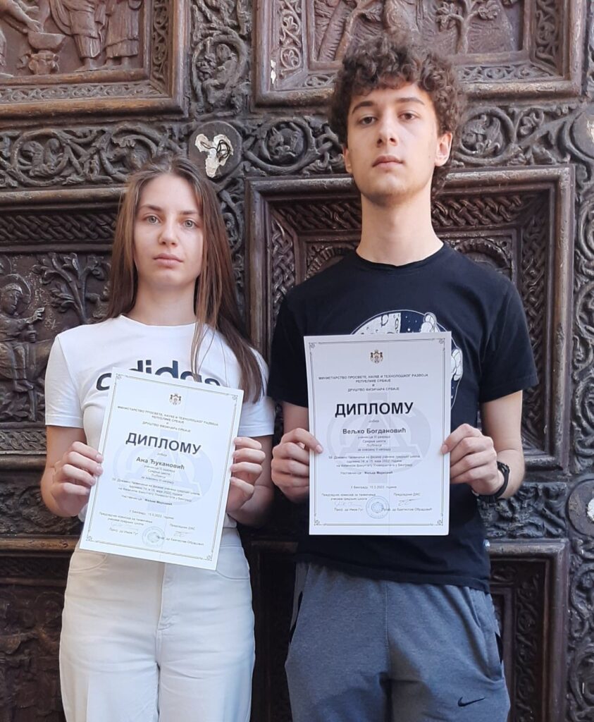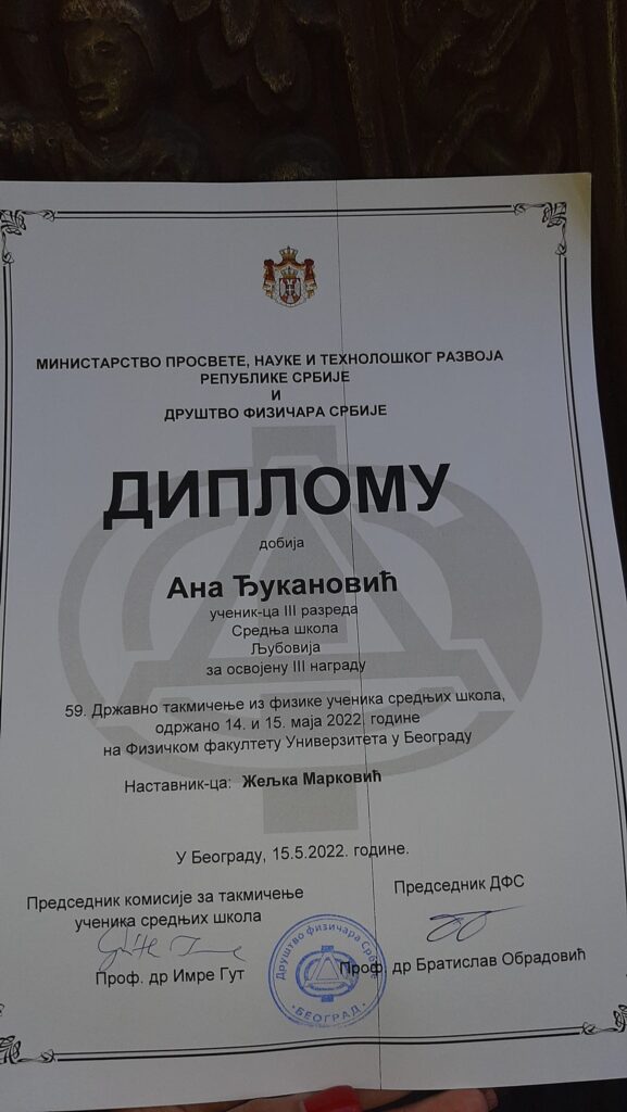 ДРУГА НАГРАДА ЗА ВЕЉКА И ТРЕЋА НАГРАДА ЗА АНУ НА ДРЖАВНОМ ТАКМИЧЕЊУ ИЗ ФИЗИКЕ