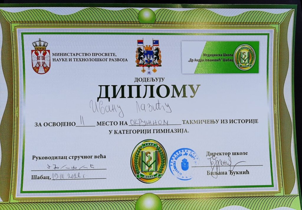 ДРУГО МЕСТО НА ОКРУЖНОМ ТАКМИЧЕЊУ ИЗ ИСТОРИЈЕ И ПЛАСМАН НА РЕПУБЛИЧКО – ИВАН ЛАЗИЋ