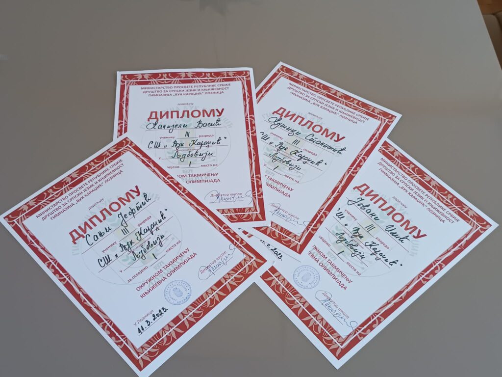 Ученици наше школе наставили су традицију успешних резултата на такмичењу из књижевности Књижевна олимпијада. Окружно такмичење Књижевна олимпијада одржано је у Гимназији “Вук Караџић” у Лозници. Нашу школу представљале су ученице: Душица Станишић, Јована Илић, Сања Јевтић, Данијела Васић – ученице трећег разреда гимназије и Ања Миловчевић- ученица првог разреда гимназије. Пласман на републичко такмичење оствариле су четири ученице: Душица Станишић, Јована Илић, Сања Јевтић, Данијела Васић.Ученике је припремао за такмичење наставник Давид Мандић.Честитке на постигнутом успеху и пуно успеха у даљем такмичењу!