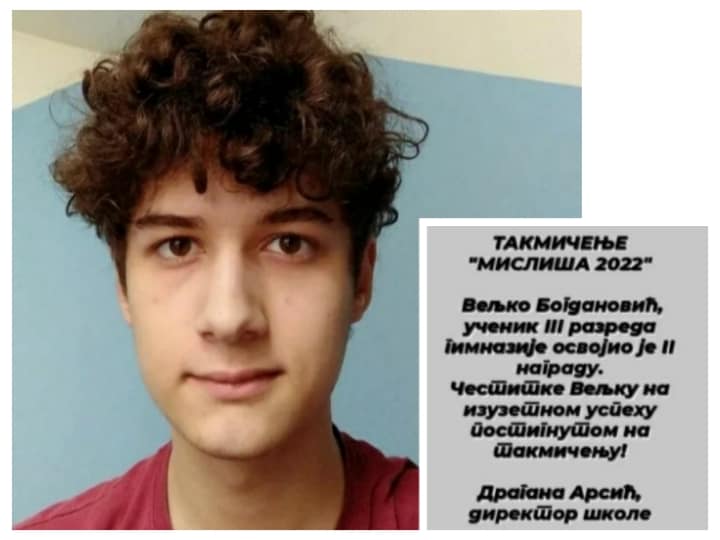 ВишеНаша школа имала је ове године представнике на математичком такмичењу “Мислиша 2022”, а међу награђеним ученицима је Вељко Богдановић, ученик III разреда гимназије који је освојио II награду. Професор ментор: Раде Лукић. Честитке Вељку на изузетном успеху постигнутом на такмичењу! Драгана Арсић, директор шко